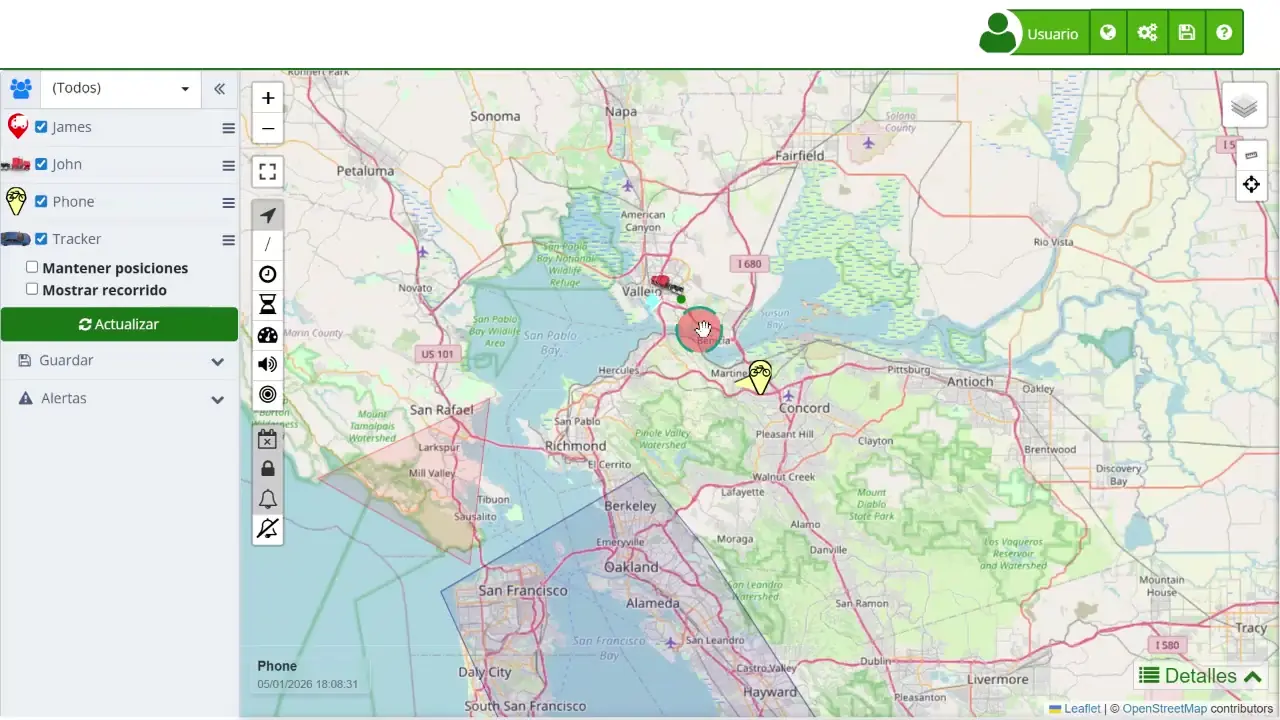 Geocercas: Los usuarios pueden crear y gestionar zonas virtuales en el mapa que generen alertas cuando un dispositivo entra o sale de dichas áreas. Estas geocercas pueden configurarse de varias formas, adaptándose a diferentes necesidades de monitoreo.